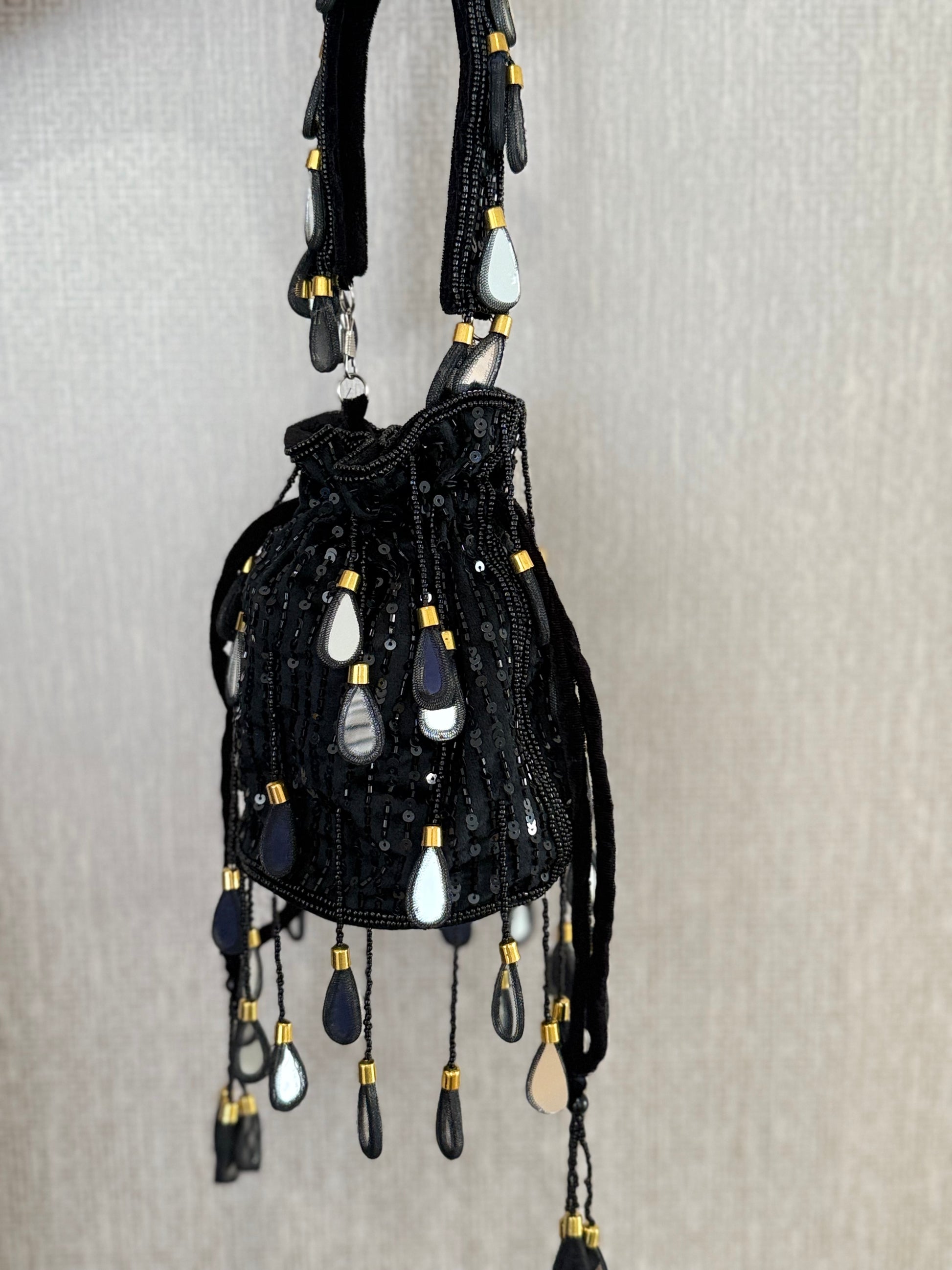 Add elegance to your Indian outfit with the Amara potli bag. Featuring beautiful mirror work, this bag is the perfect accessory to elevate your look. Carry your belongings in style and make a statement with this must-have piece.