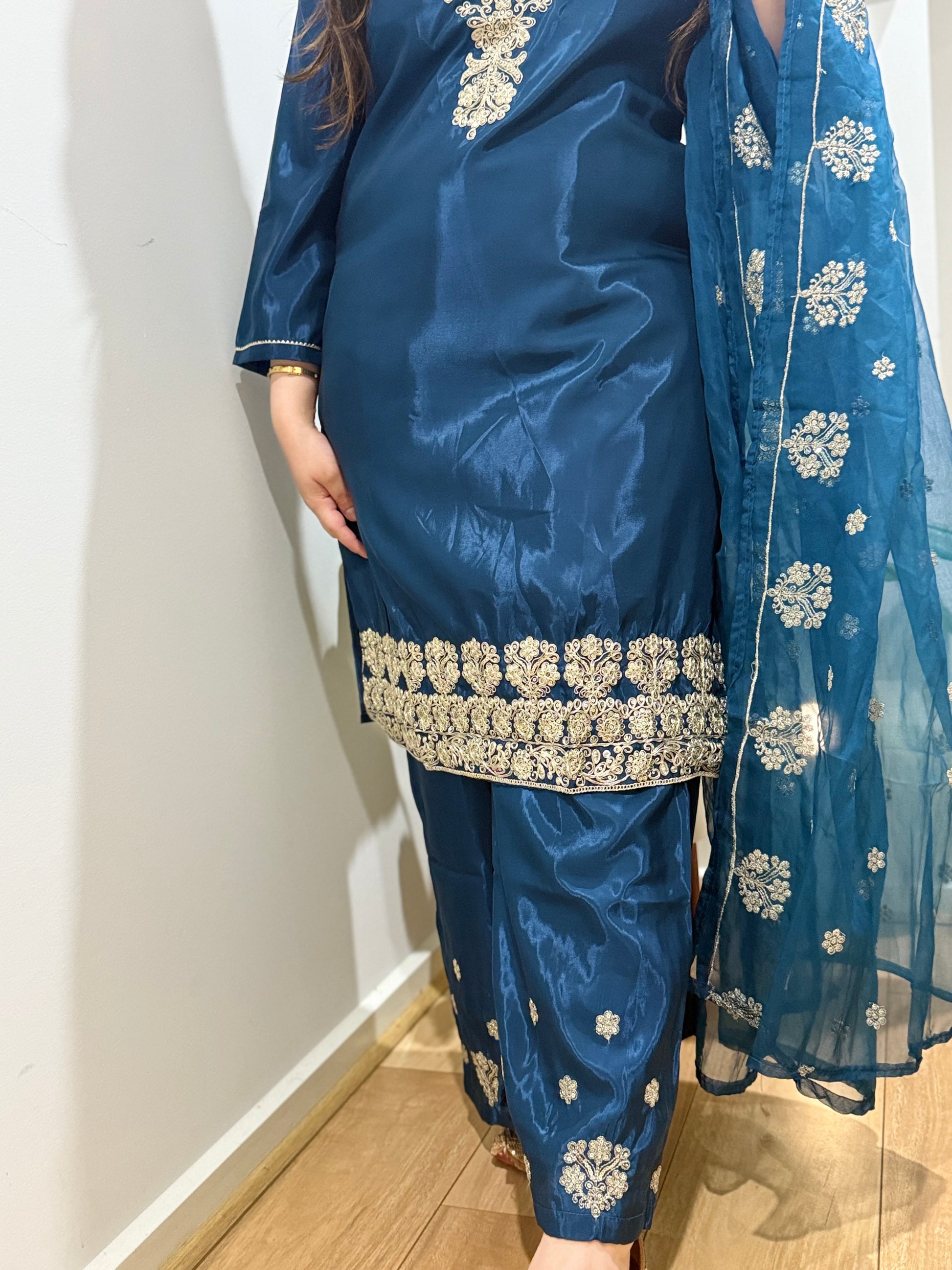 Premium quality jimmychootissue suit with pants and organza dupatta