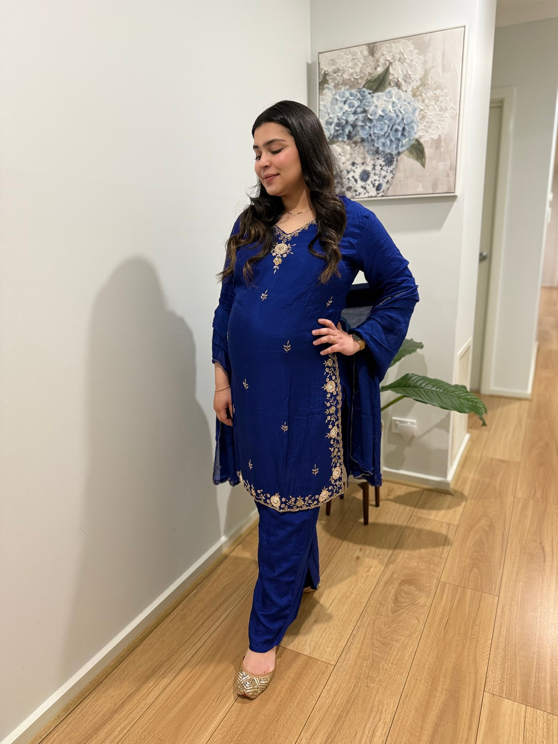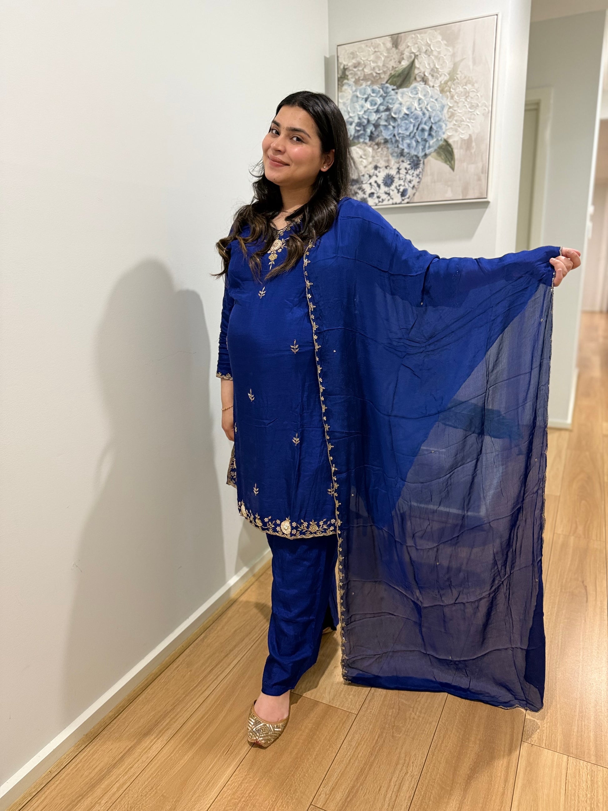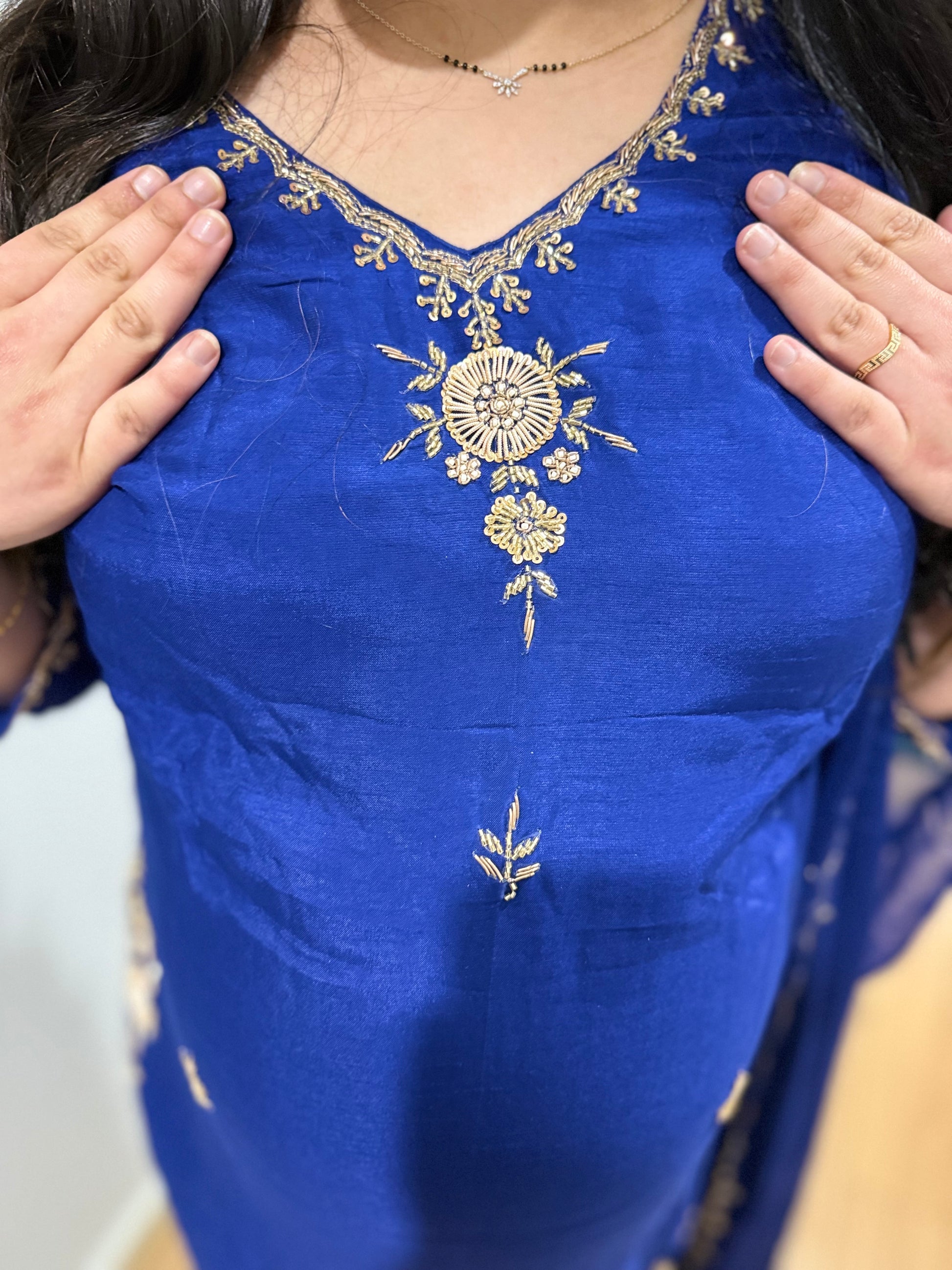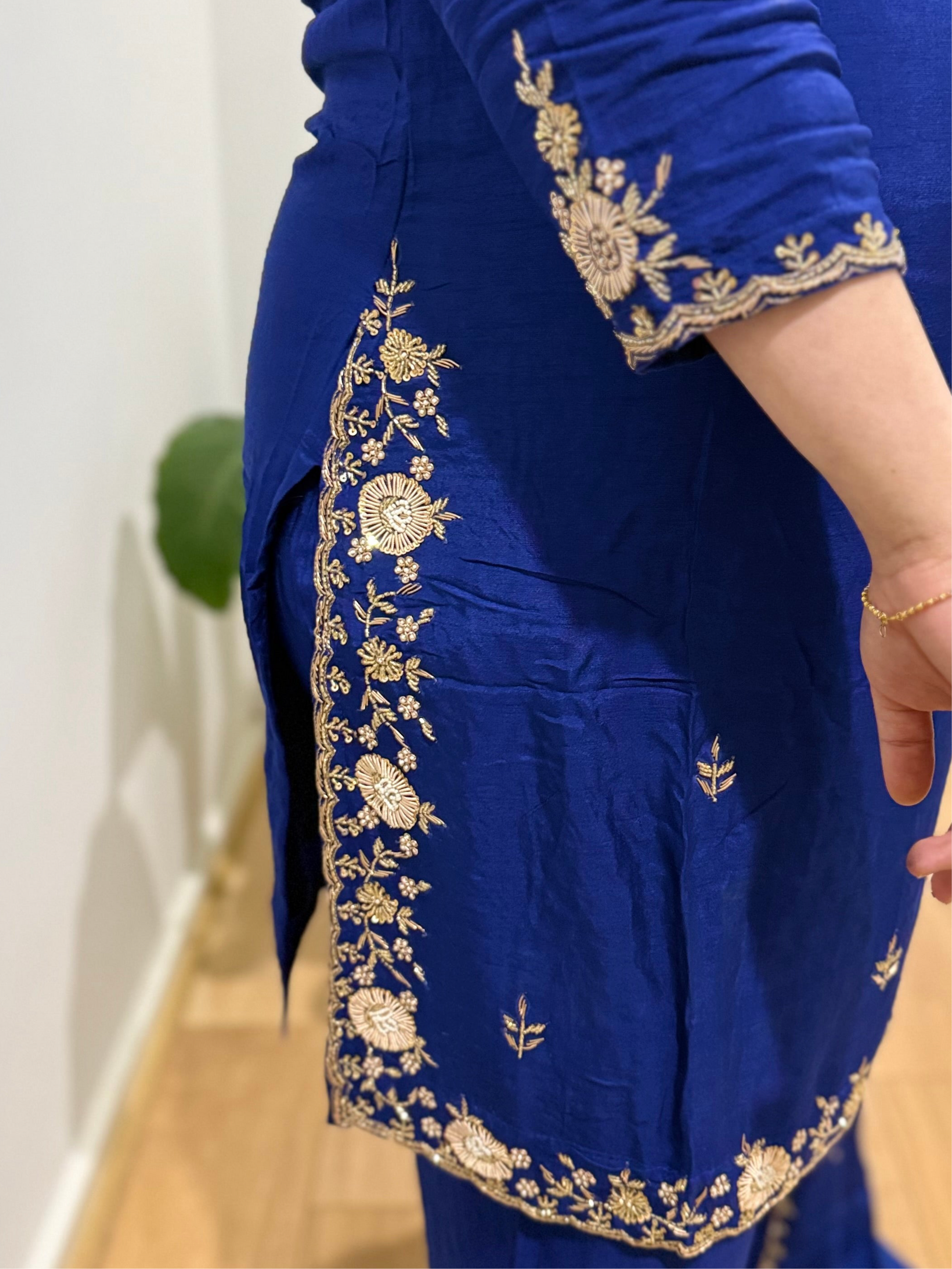 Premium quality silk top with hand work and silk plazzo with full lining in too and bottom and chiffon dupatta