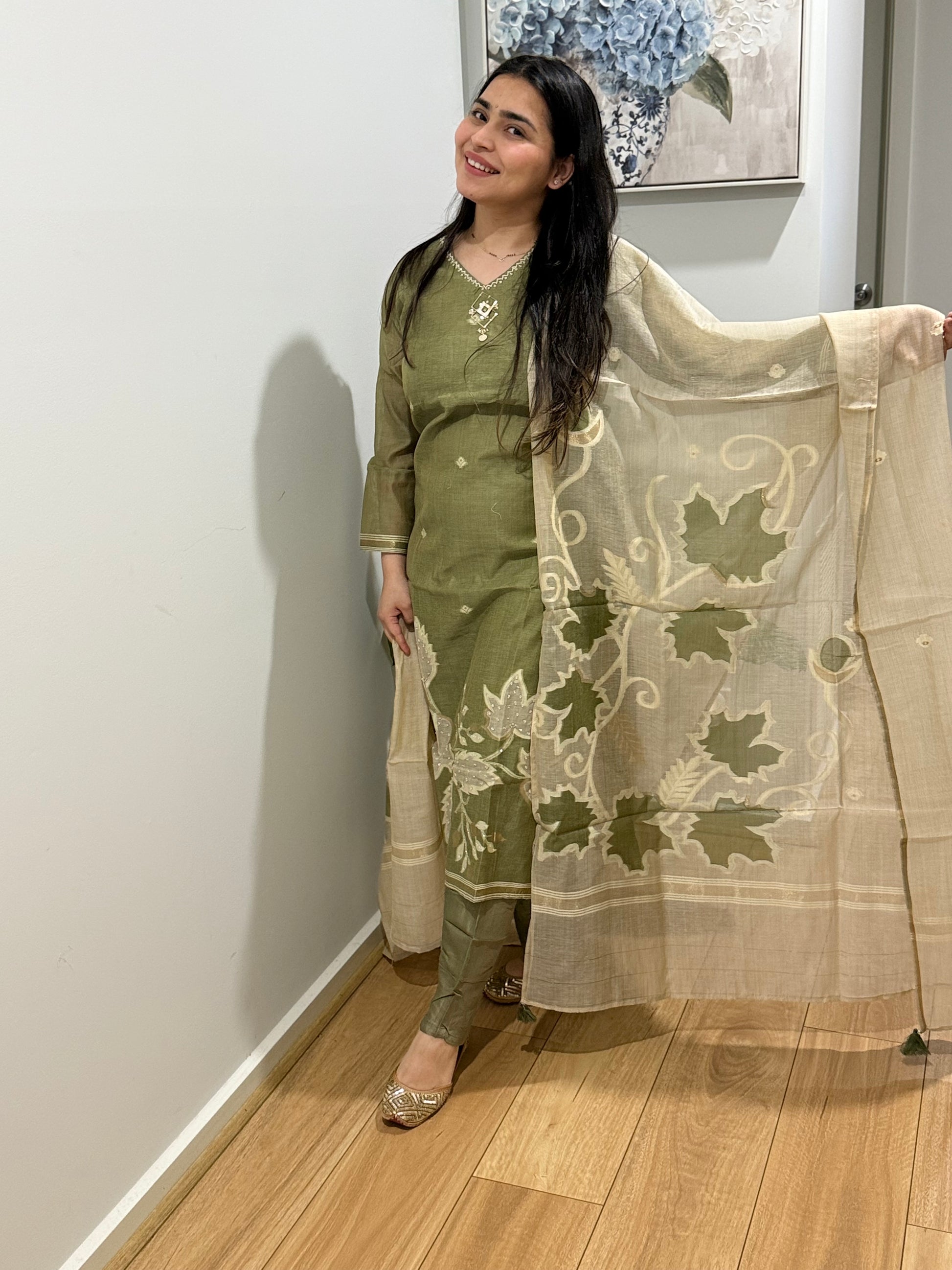 Premium quality mul chanderi suit with pants and mulchanderi dupatta
