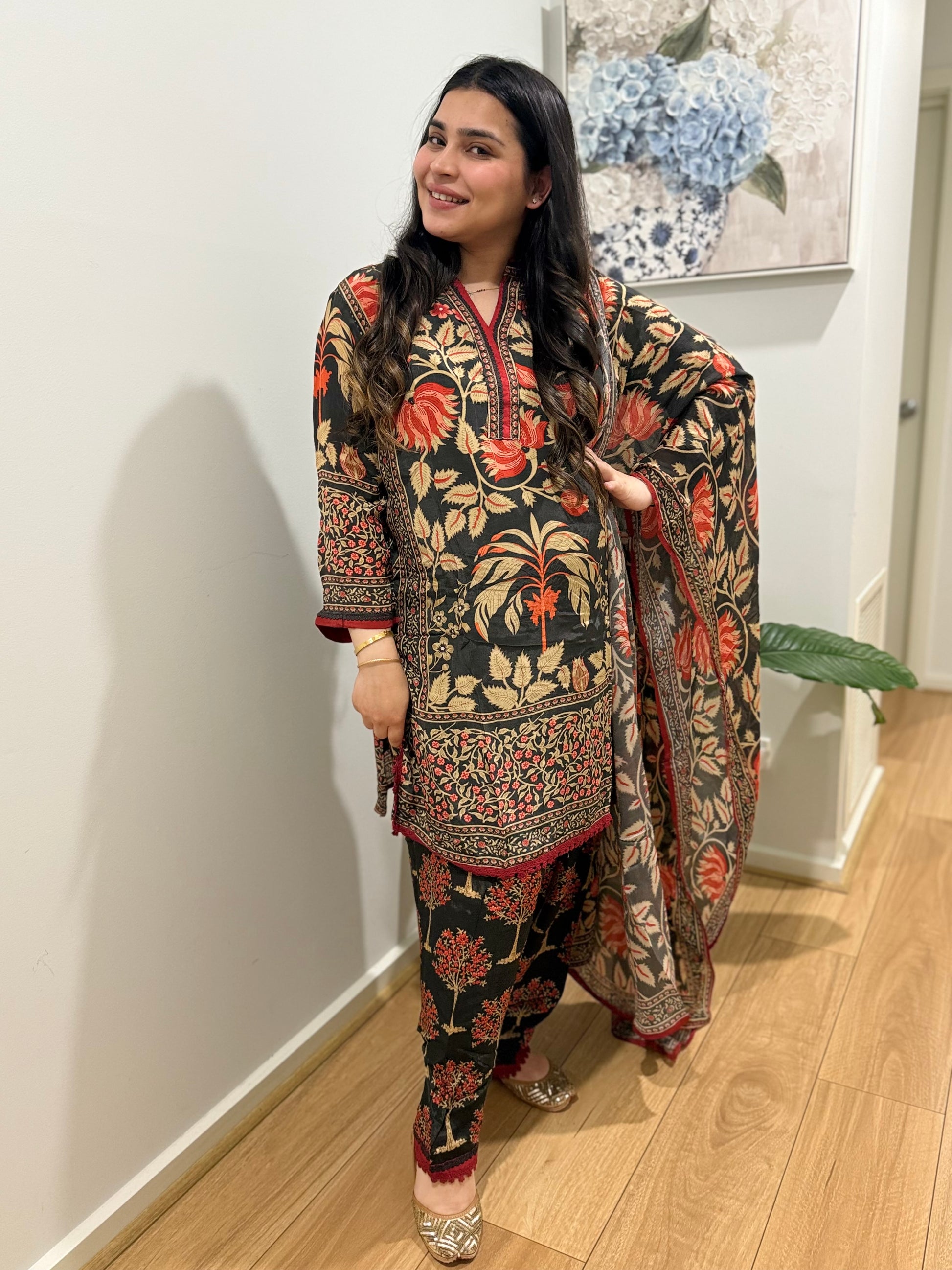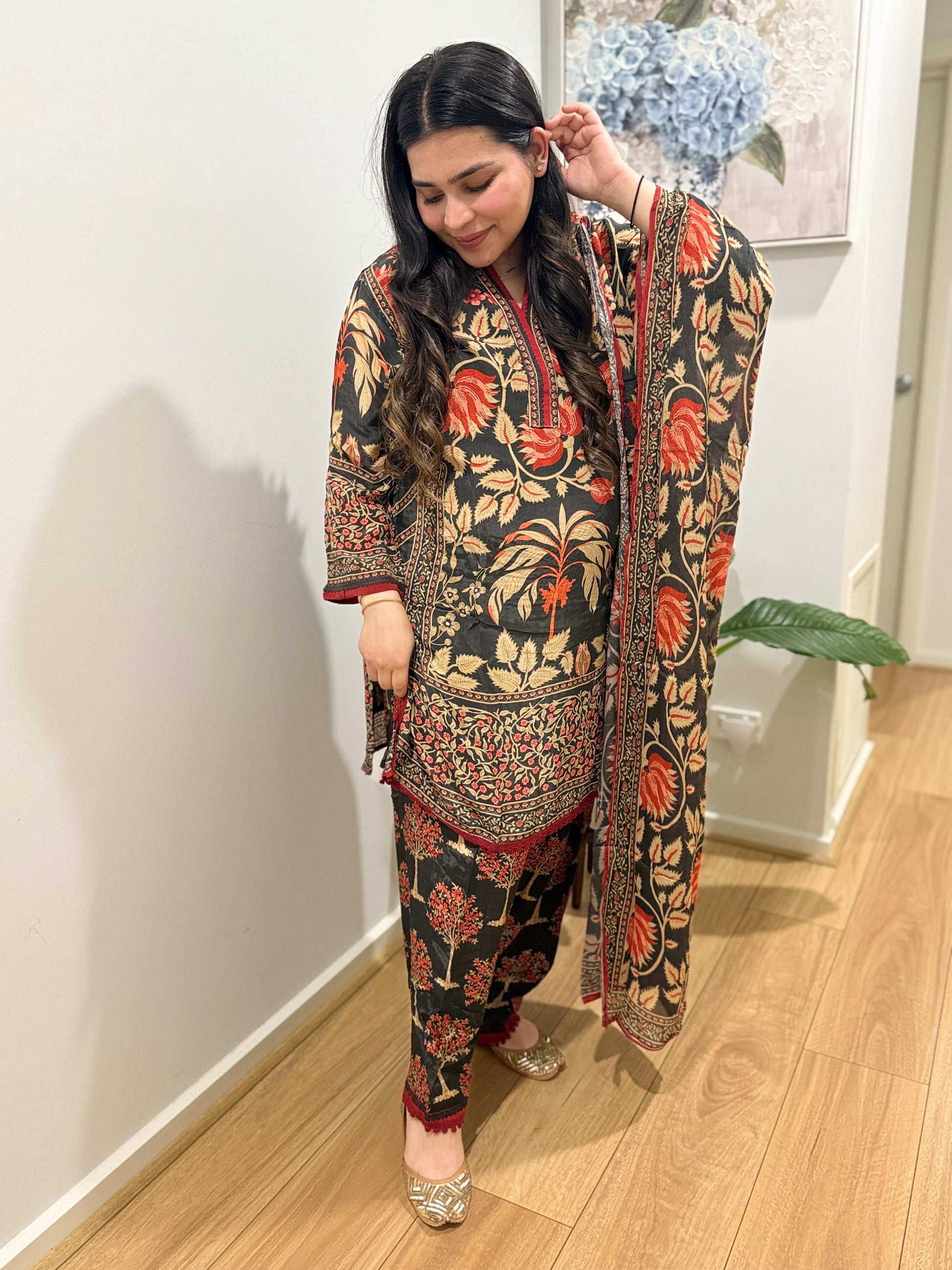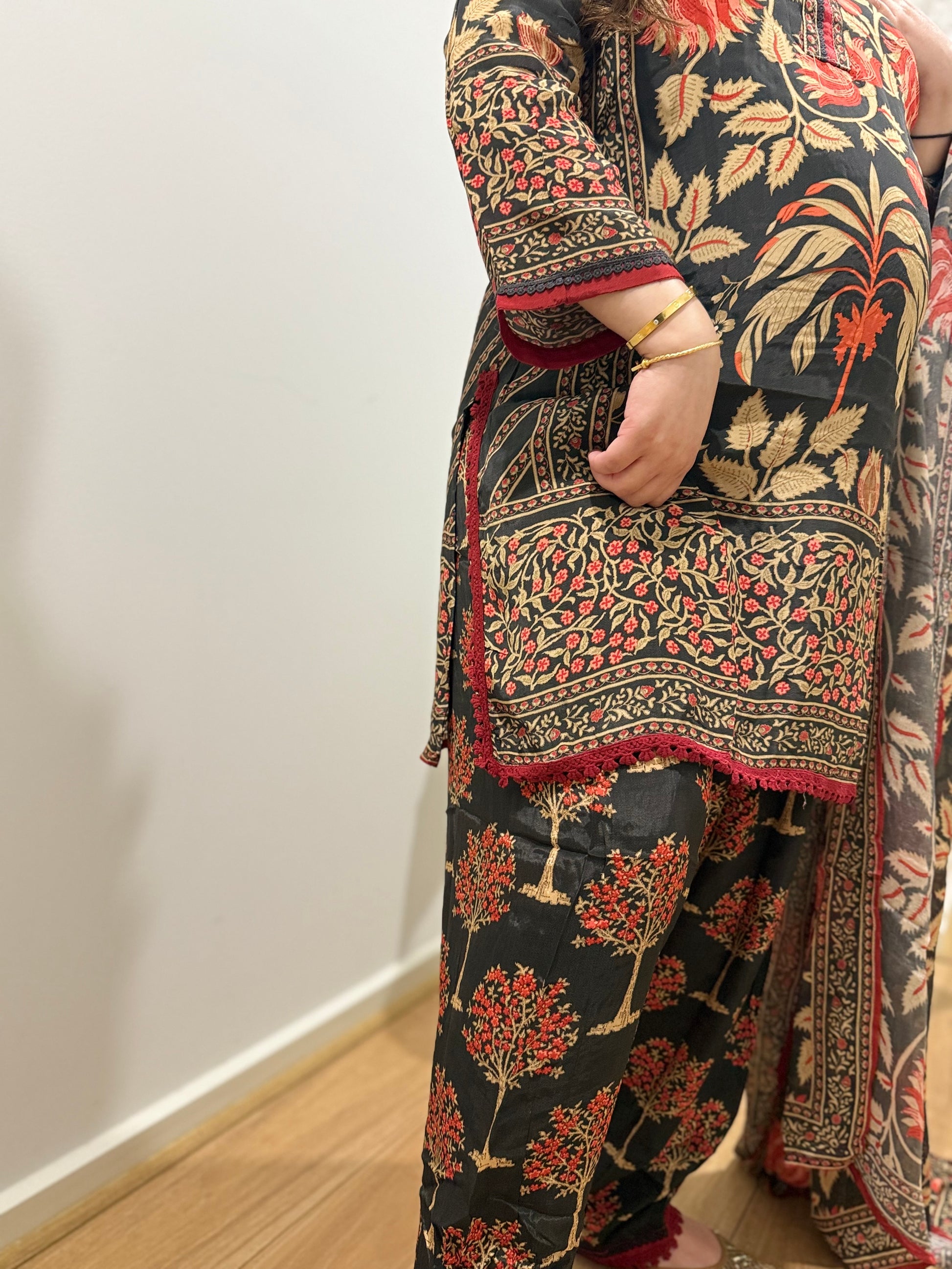 Premium quality crepe salwar suit with lining and chinnon dupatta. Includes lace detailing and lining and certainly a piece not to be skipped!!