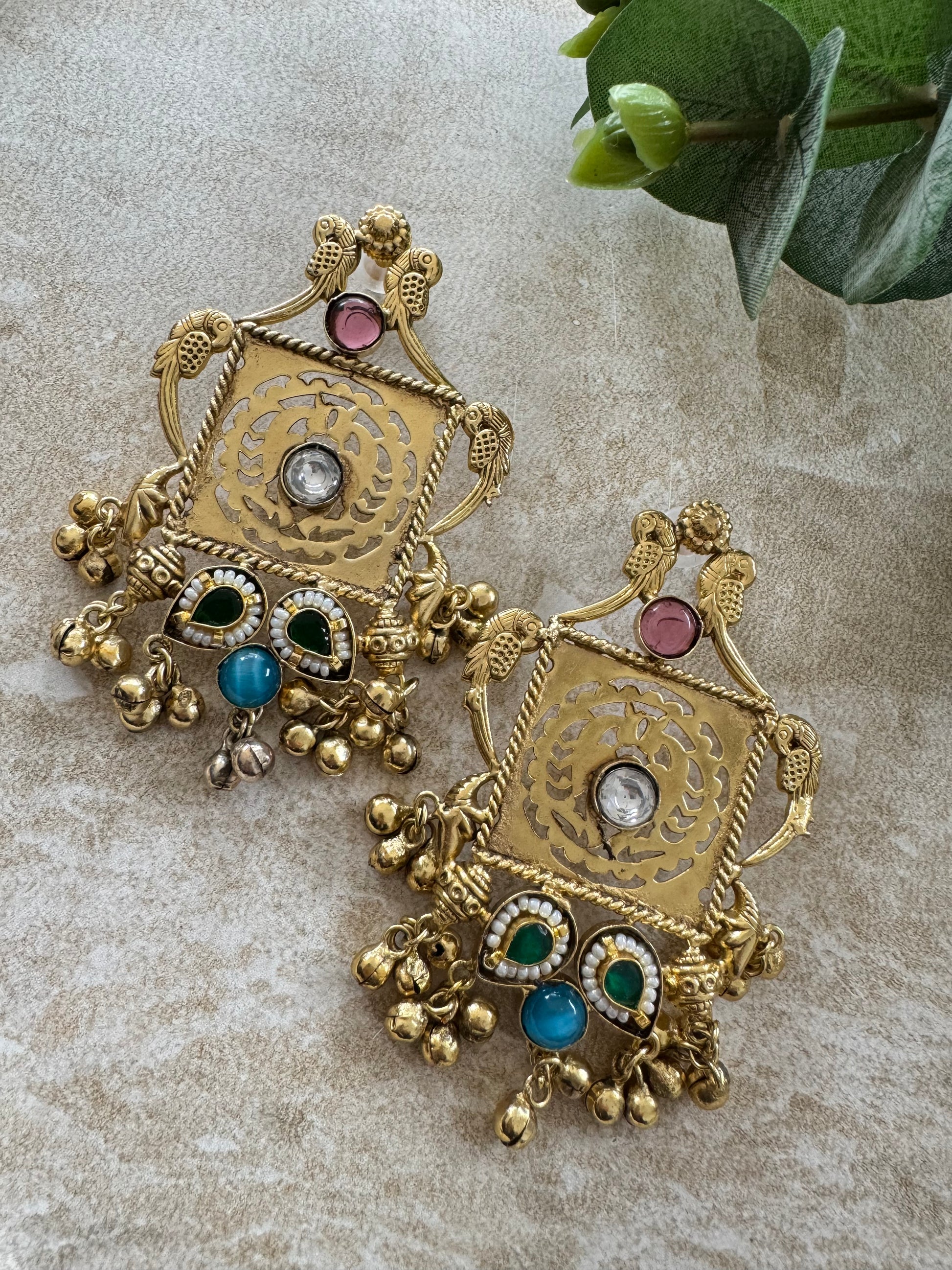 Brass made- lightweight- ghunghroo earrings in gold polishing with monalisa stones in premium and statement finishing.
