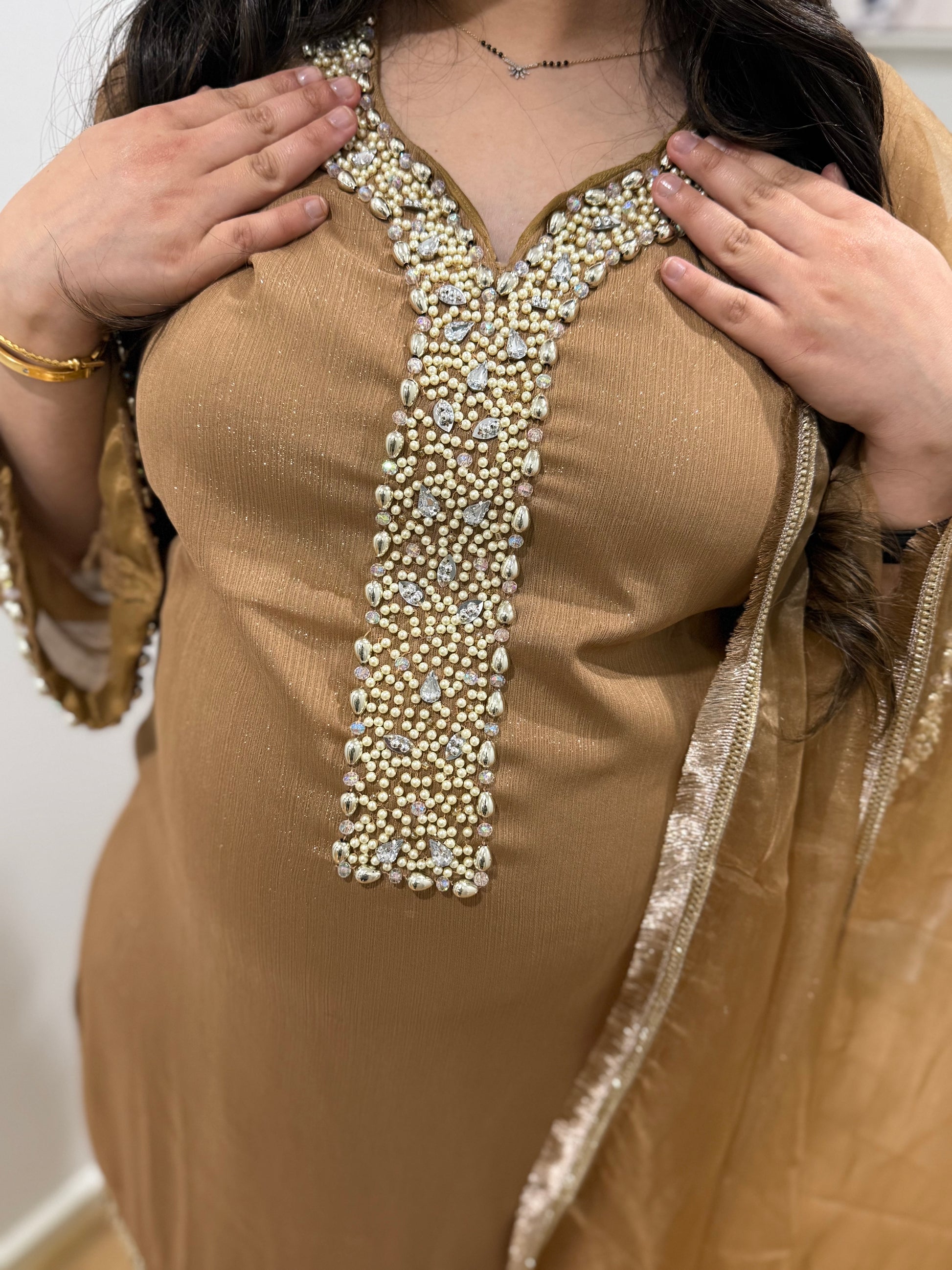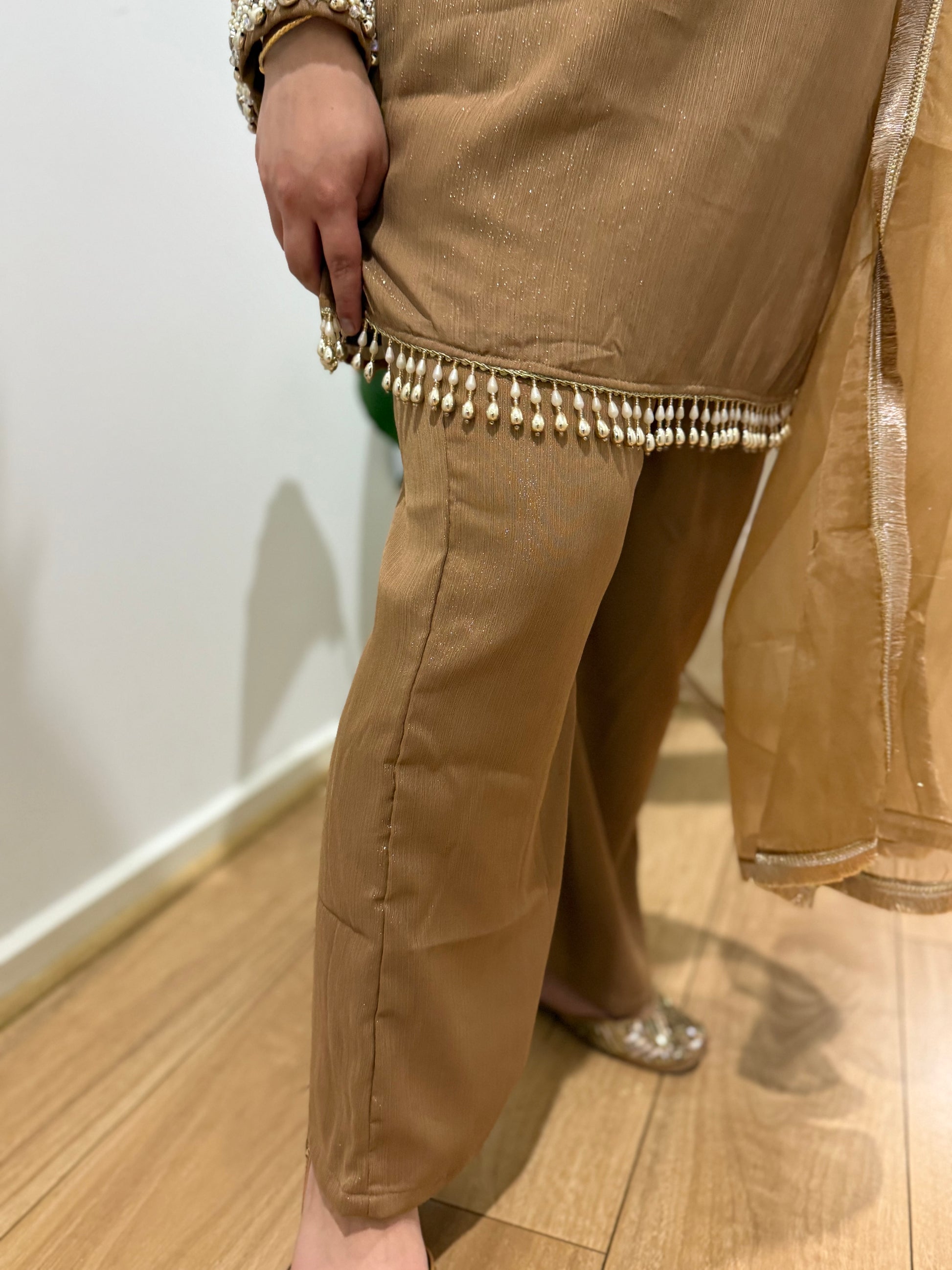 Premium quality chinnon shimmer suit with pants and dupatta