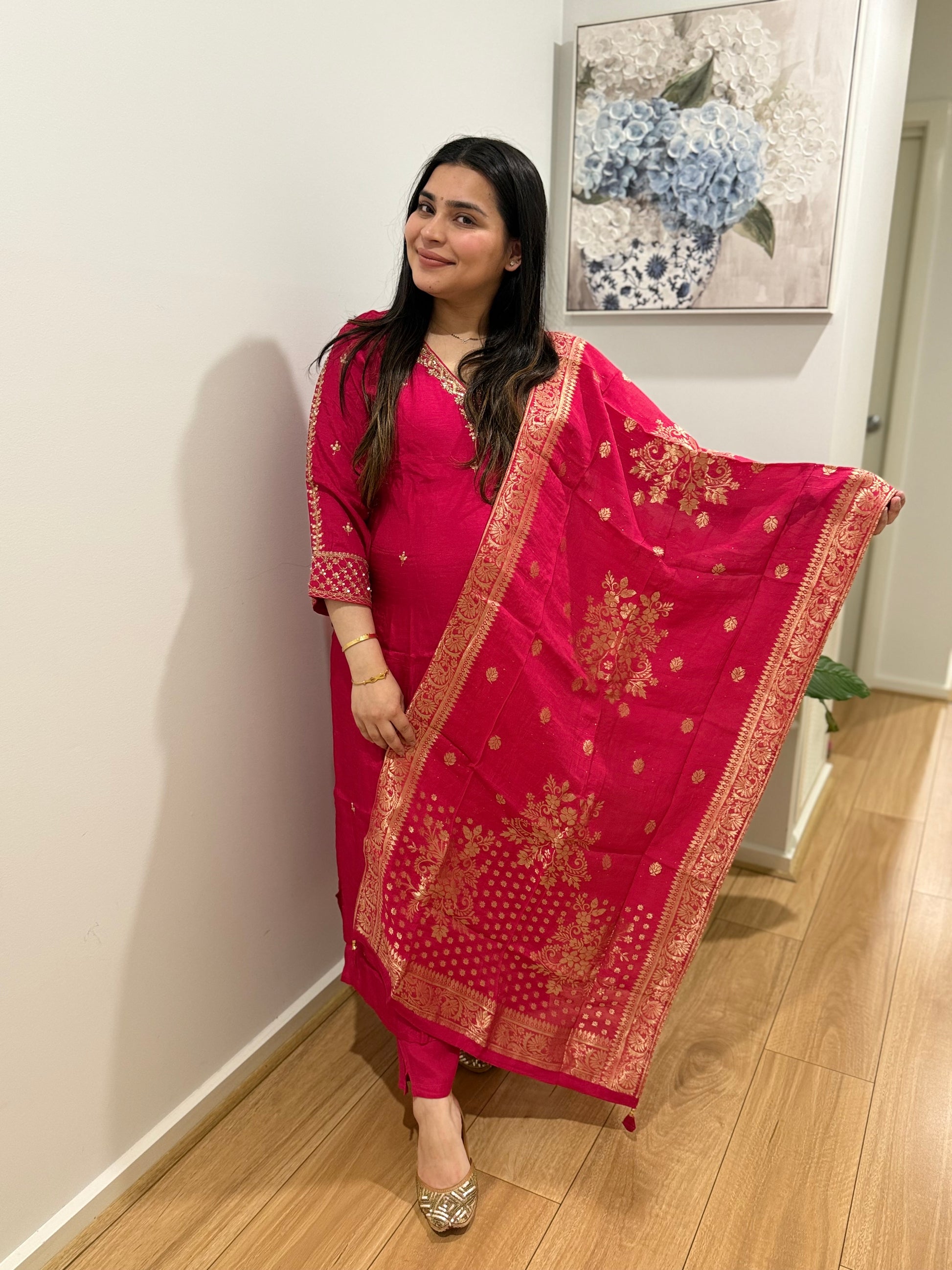 Premium quality silk suit with pants and banarsi dupatta