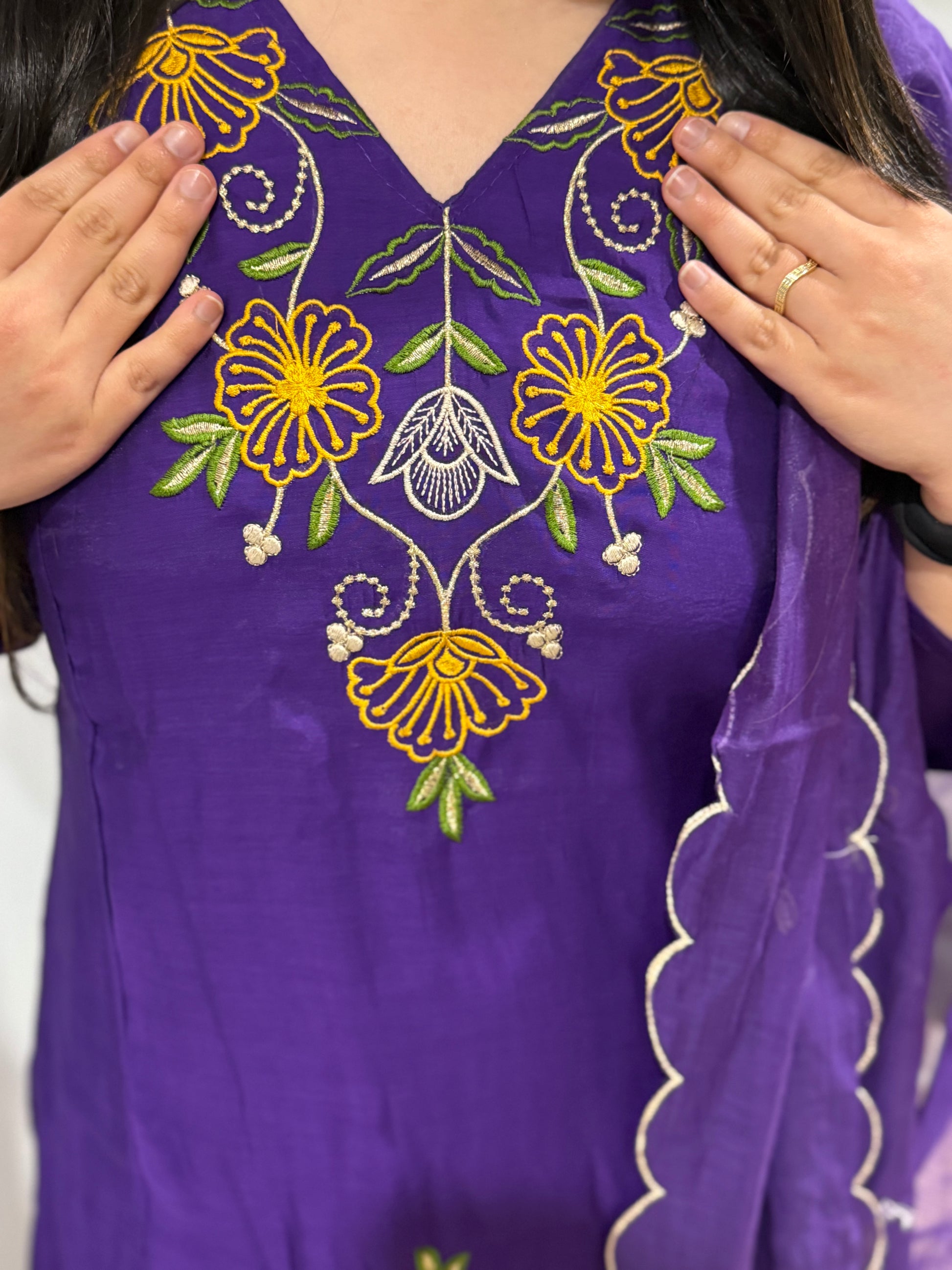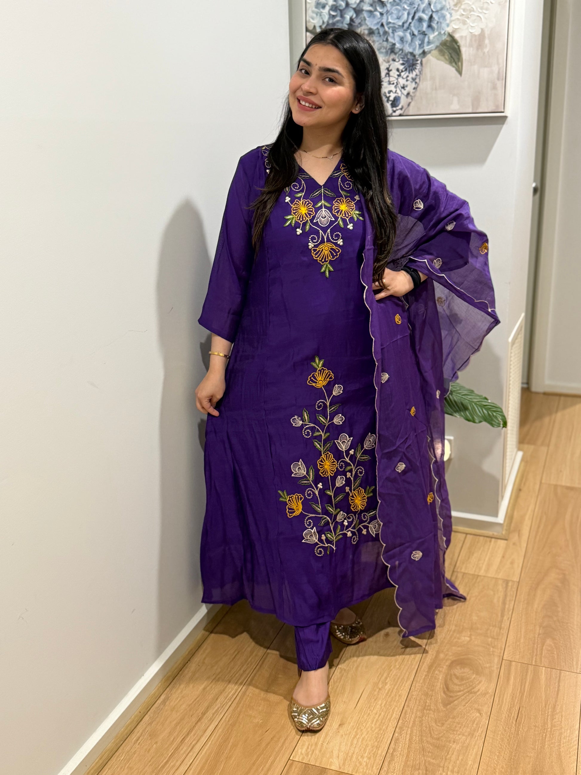 Premium quality muslin silk aline suit with lining and embroidery on the yoke and sleeves. Luxury dupatta on muslin fabric and straight pants