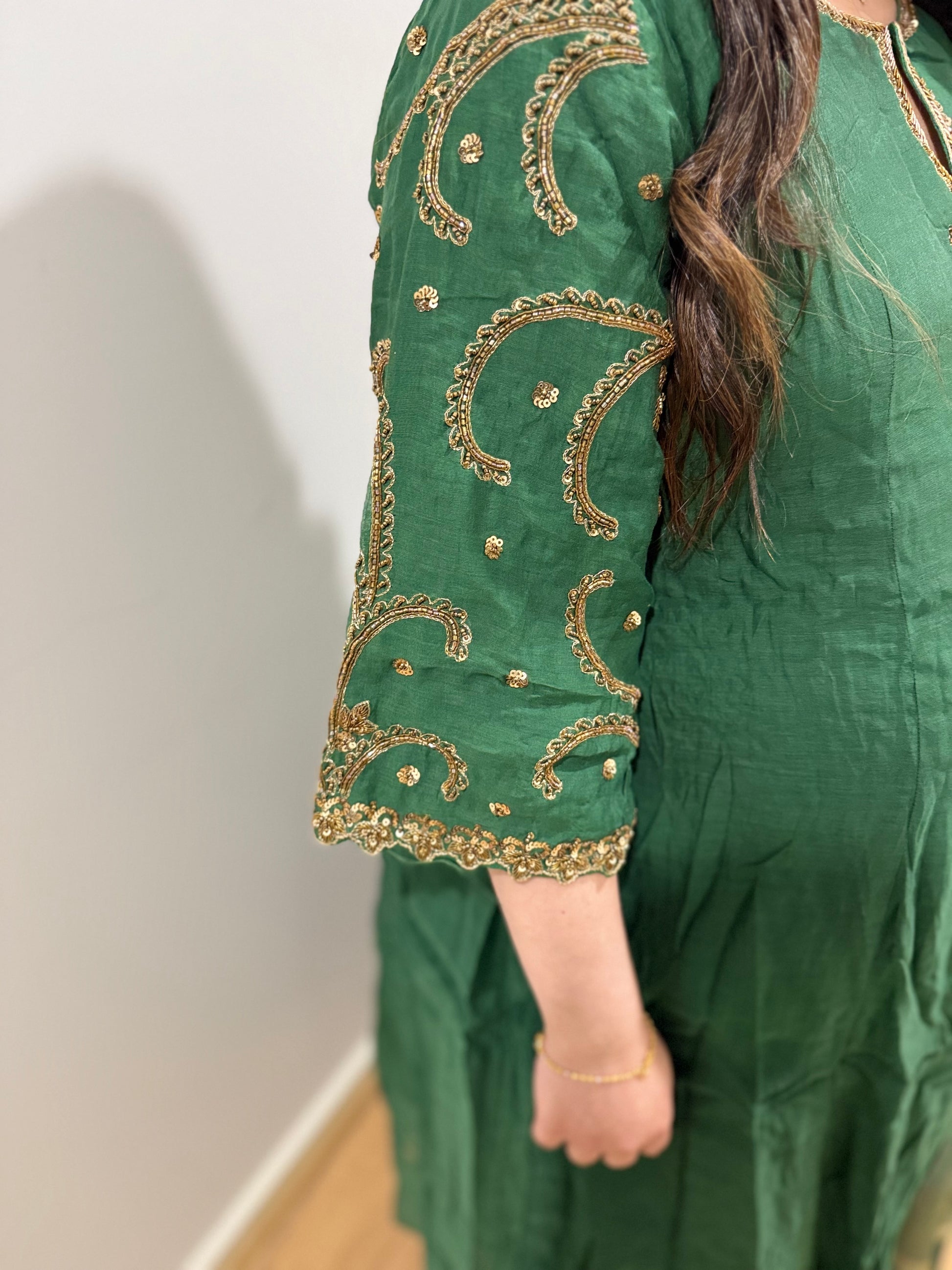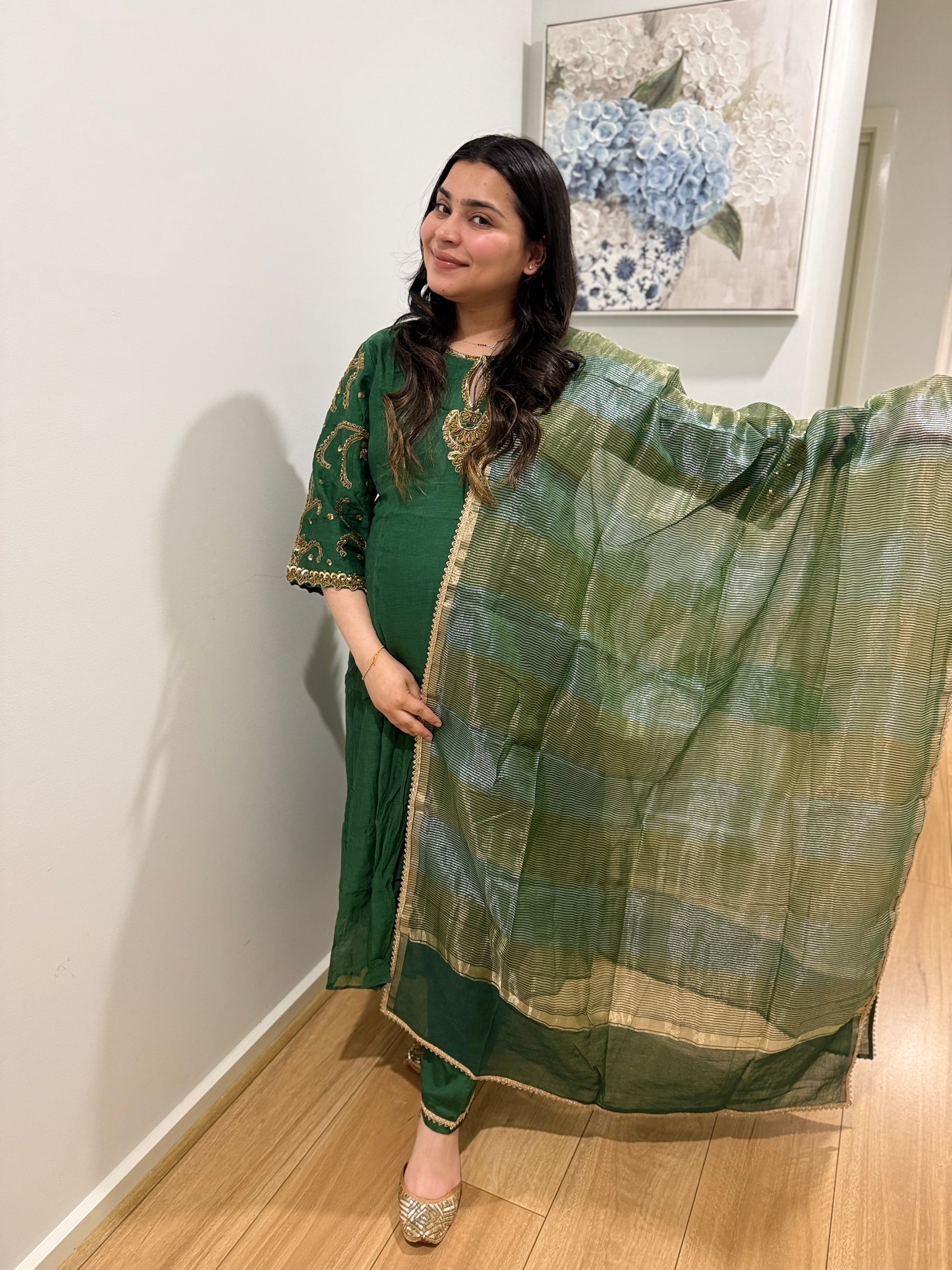 Premium quality mul chanderi anarkali suit with lining and handwork on the yoke and sleeves. Luxury dupatta on tissue fabric and straight pants