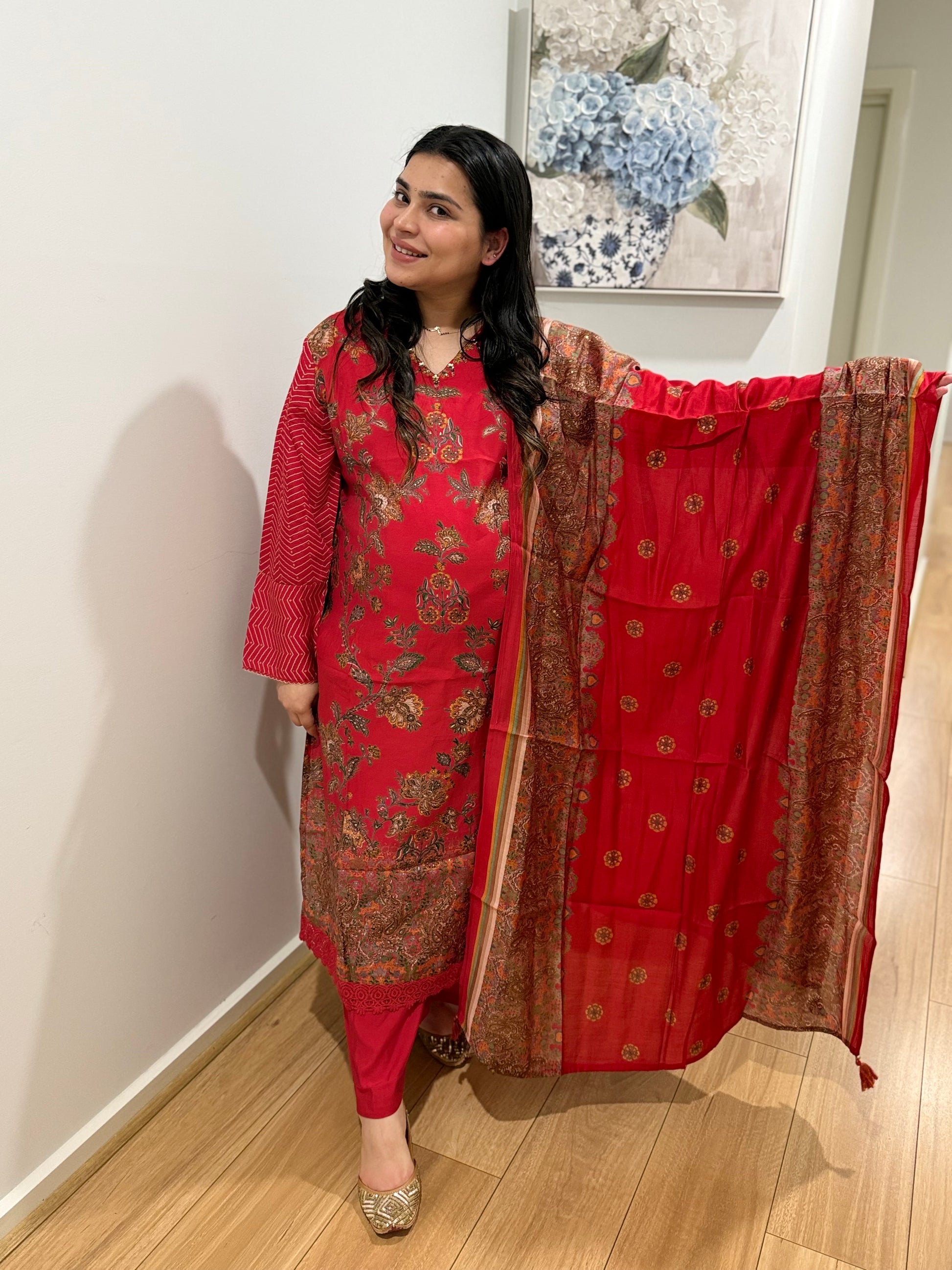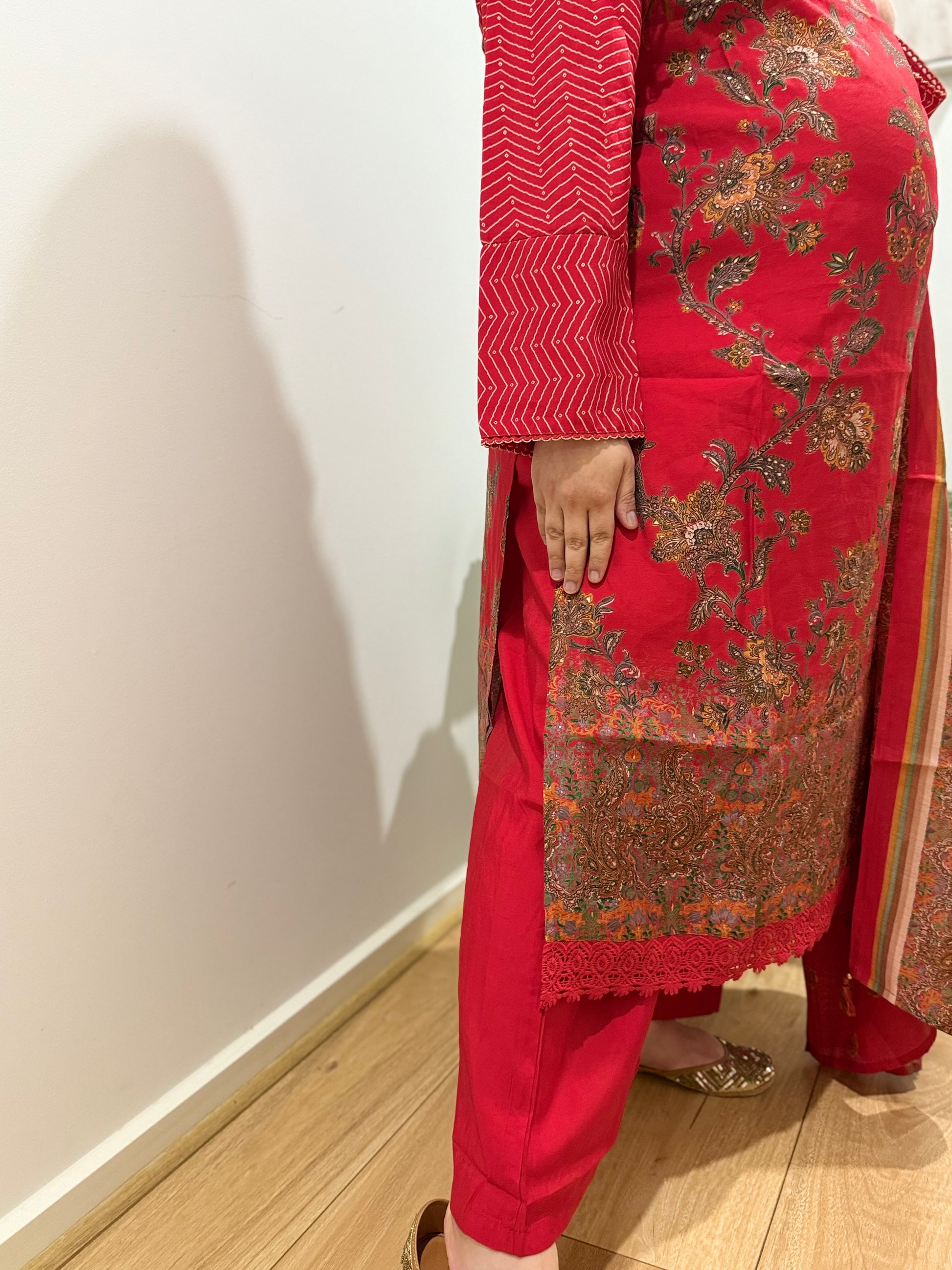 Three piece printed suit with kalamkari inspiration and muslin fabric