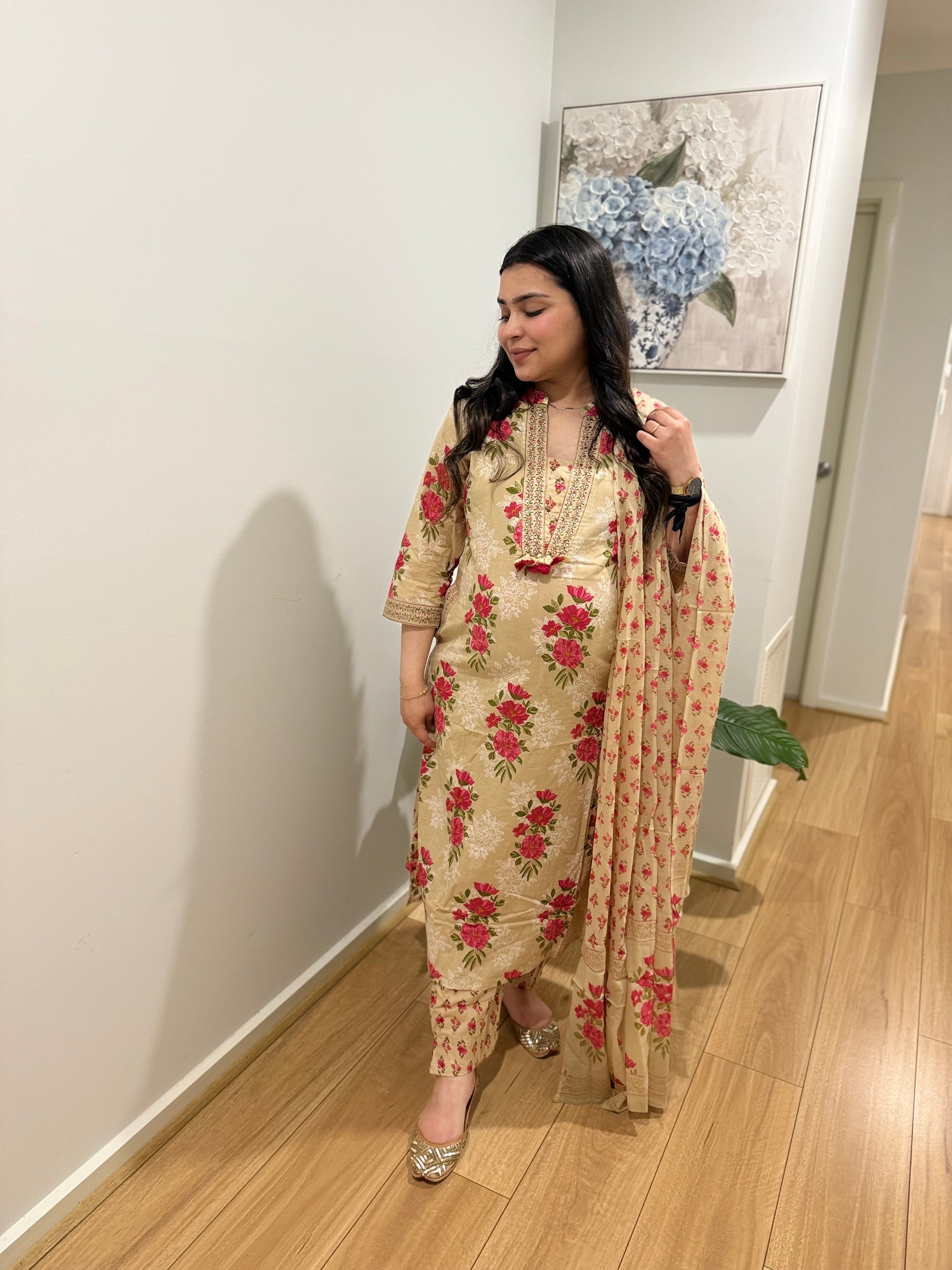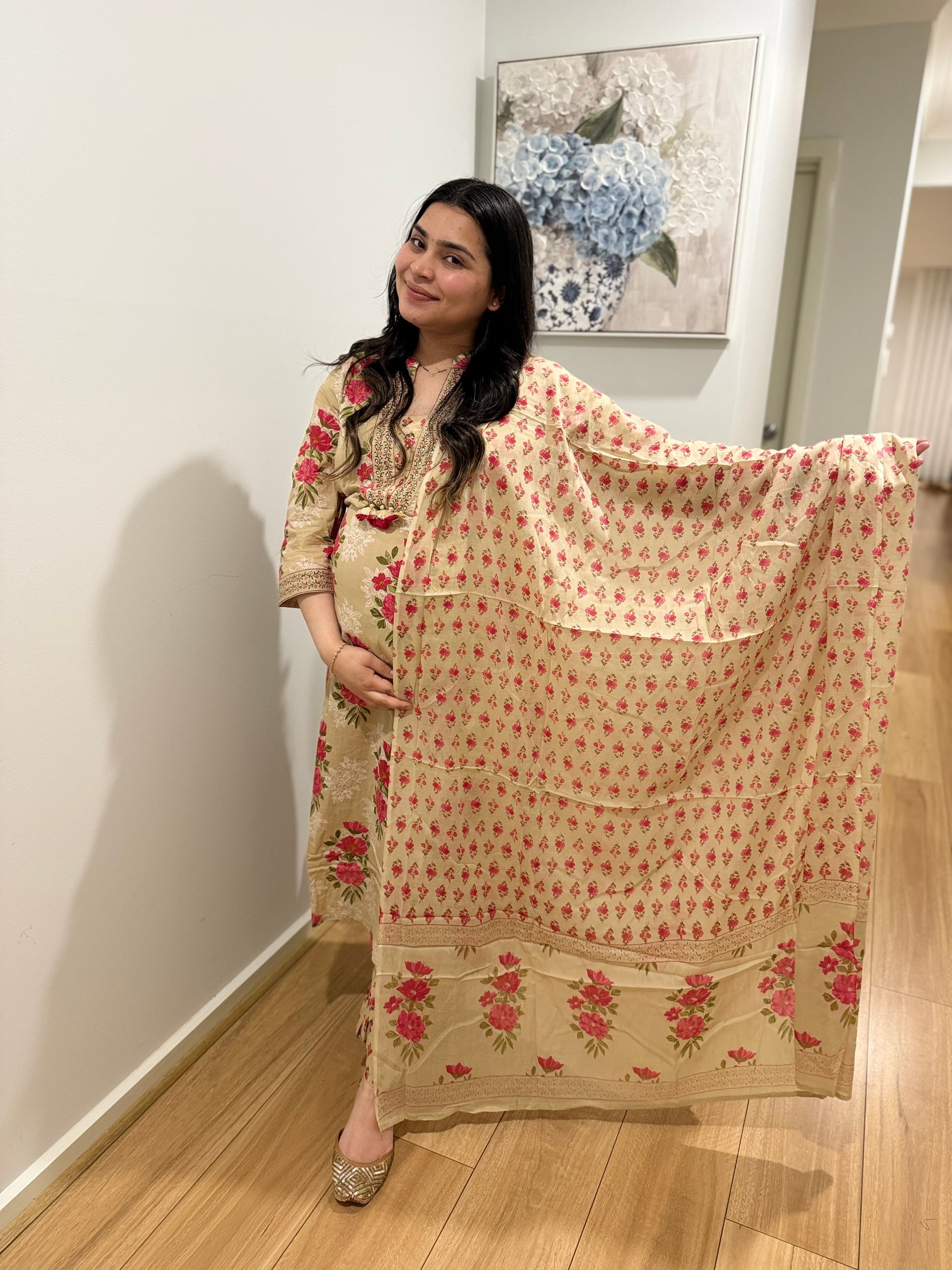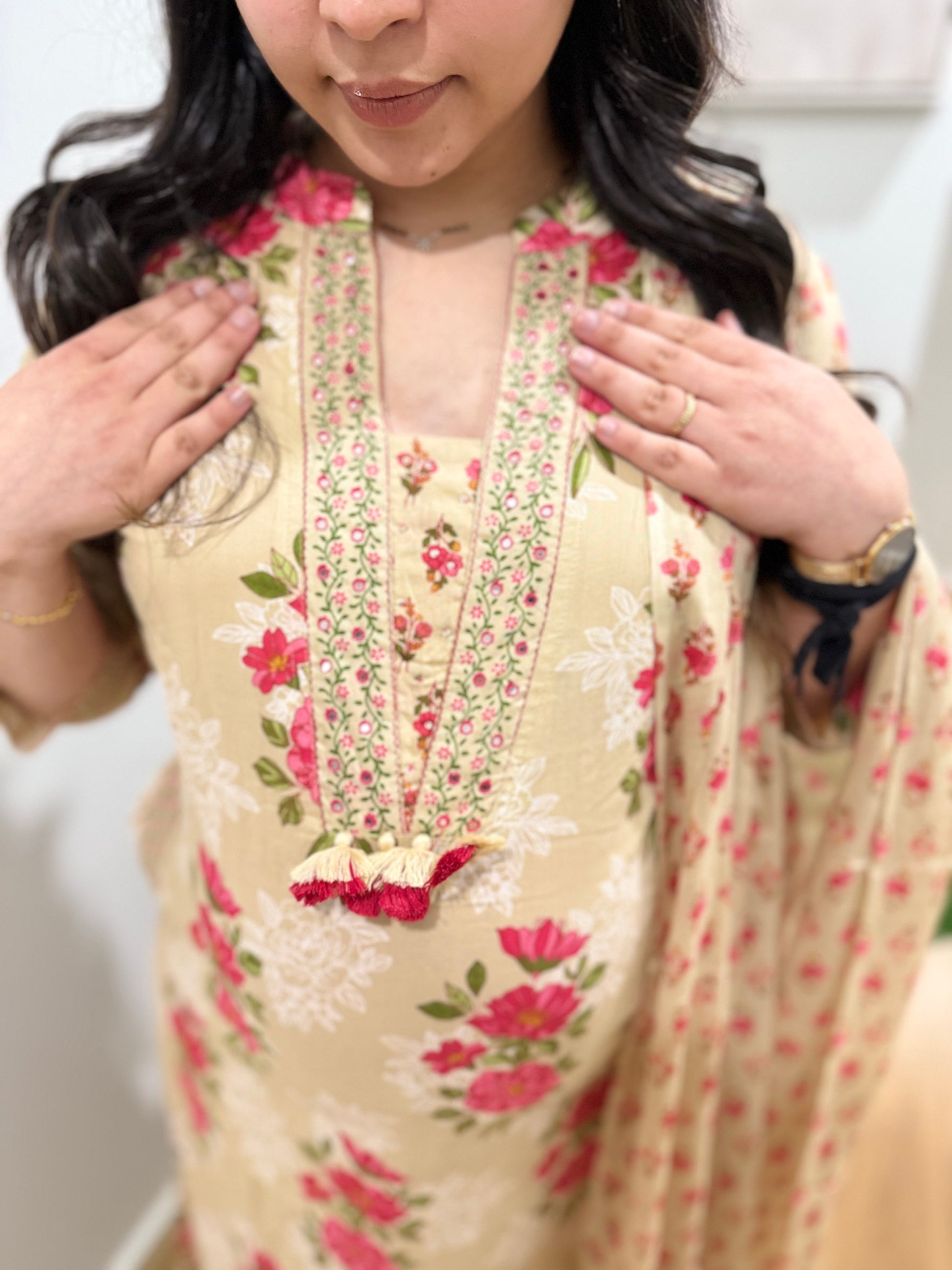 Premium quality printed cotton suit with straight pants and mul cotton dupatta