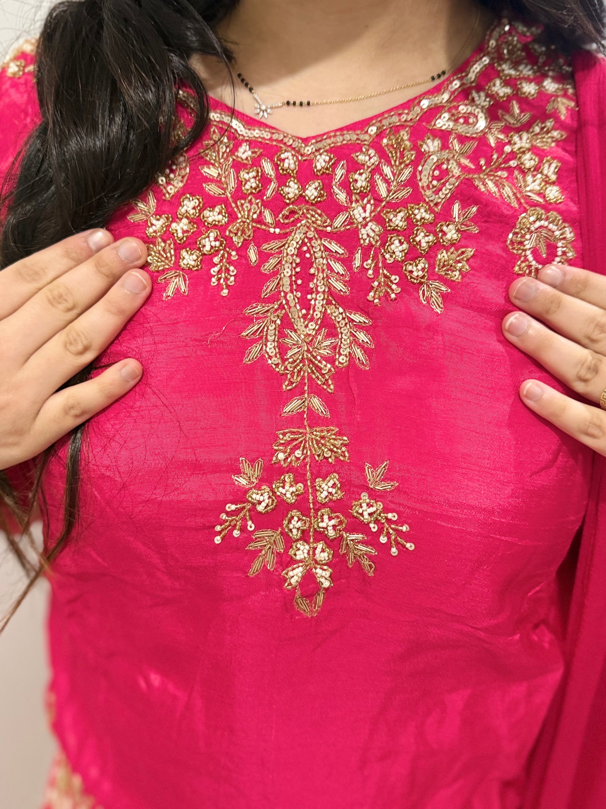 Premium quality silk short top with mirror work and chinnon plazzo and tissue dupatta