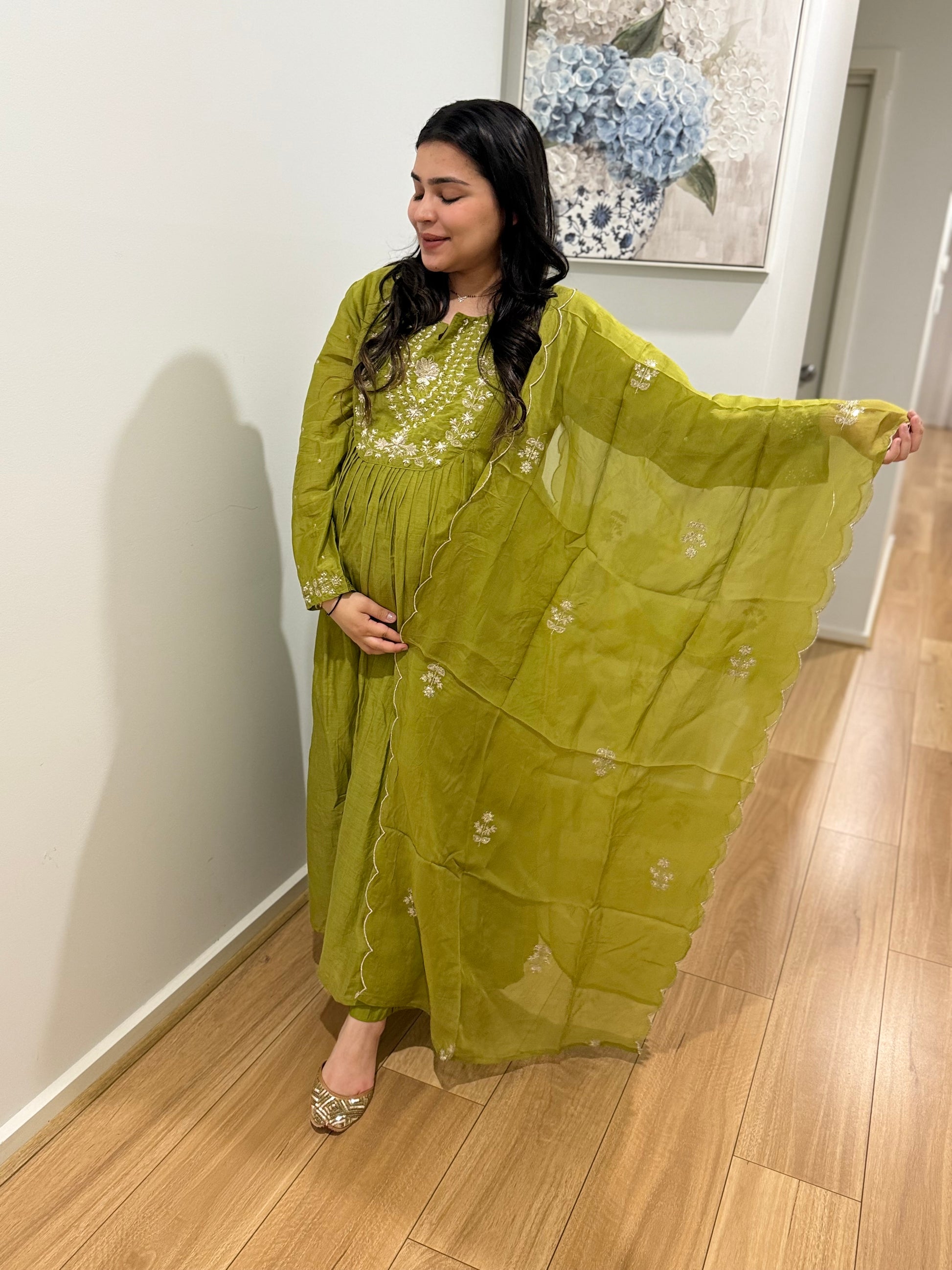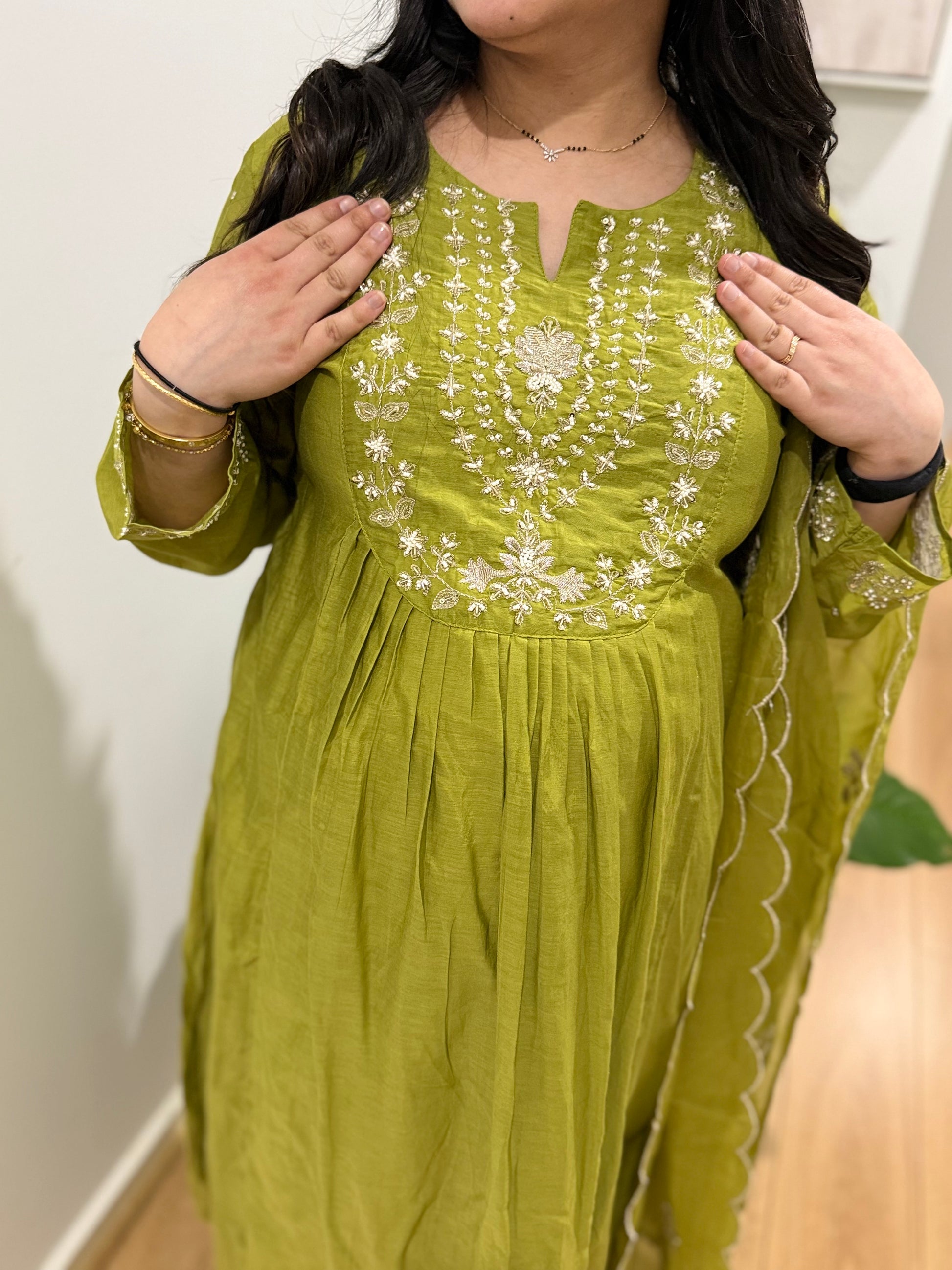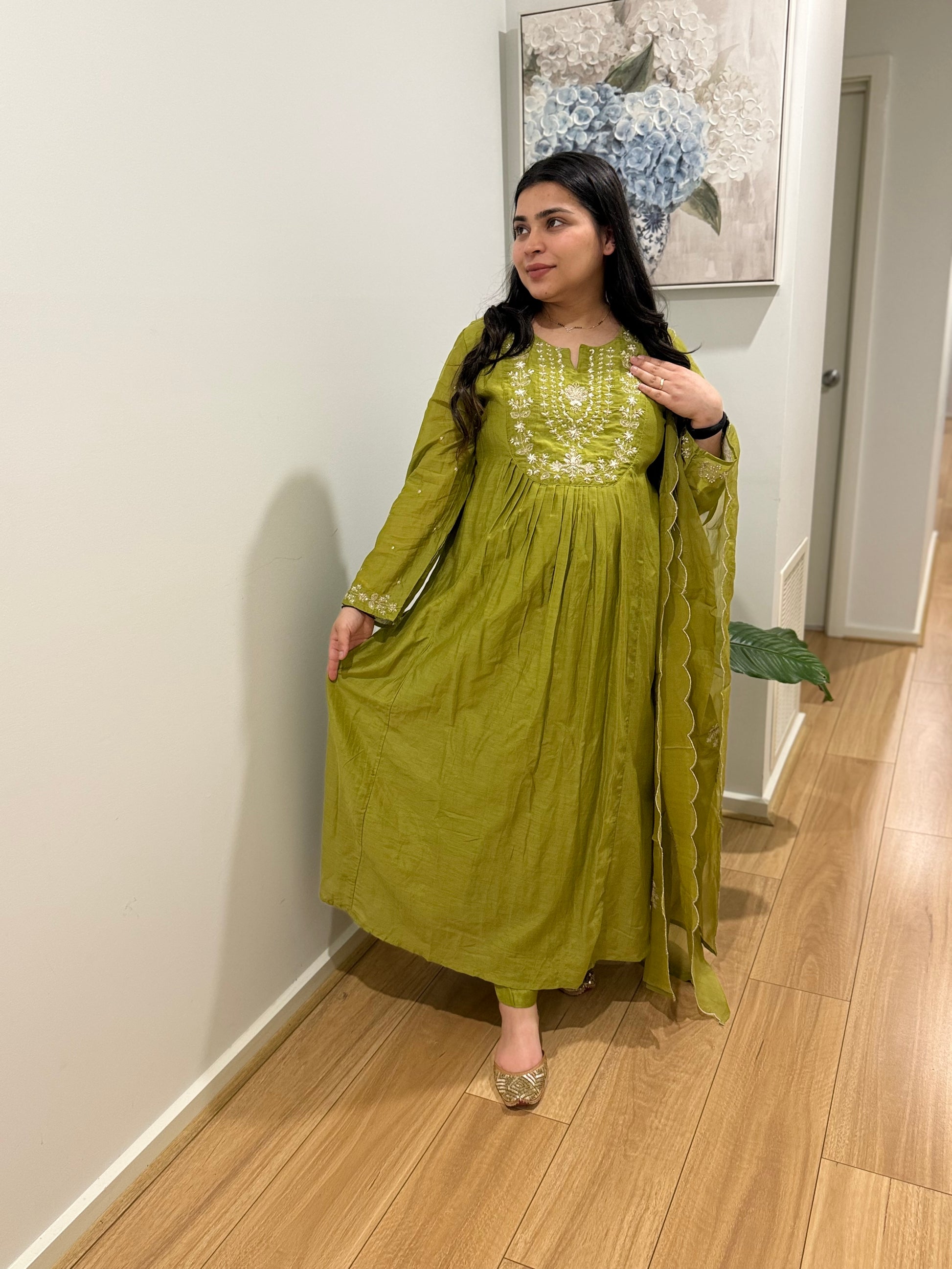 Premium quality mul chanderi anarkali suit with lining and handwork on the yoke and sleeves. Luxury dupatta on tissue fabric and straight pants