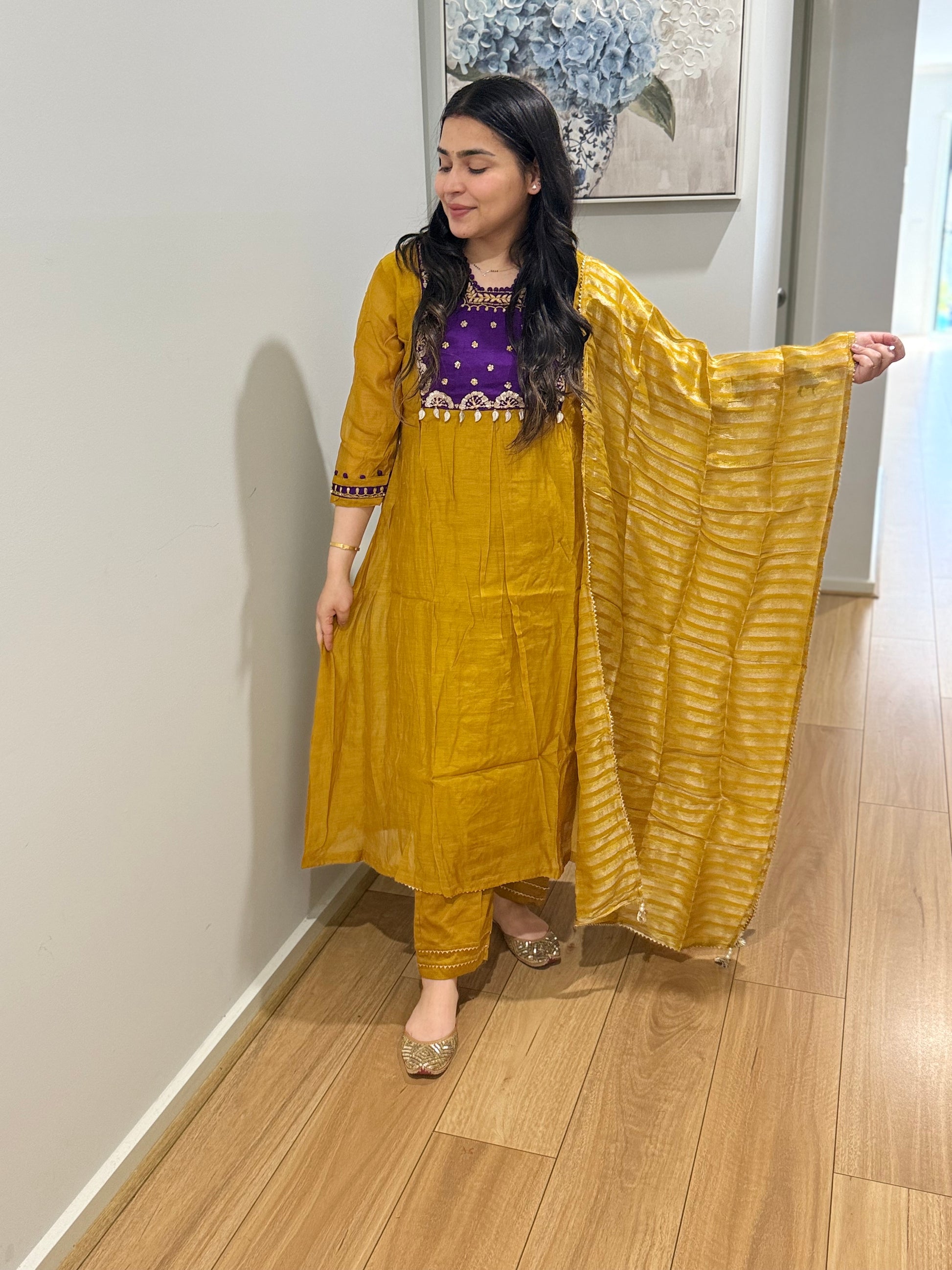 Premium quality mul chanderi anarkali suit with lining and handwork on the yoke and sleeves. Luxury dupatta on tissue fabric and straight pants